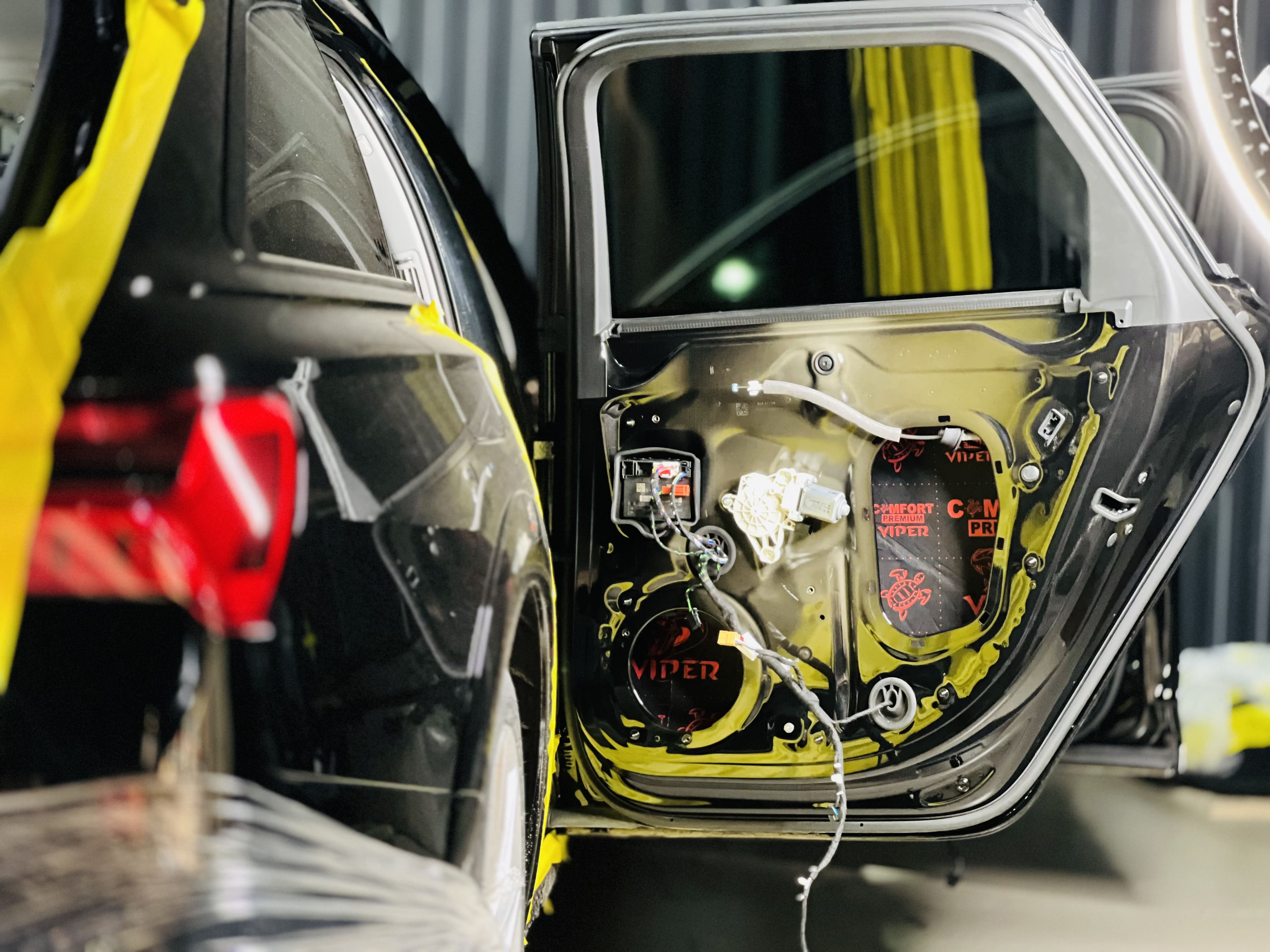 Первым слоем на двери нанесли виброизоляцию Comfort Mat Viper.