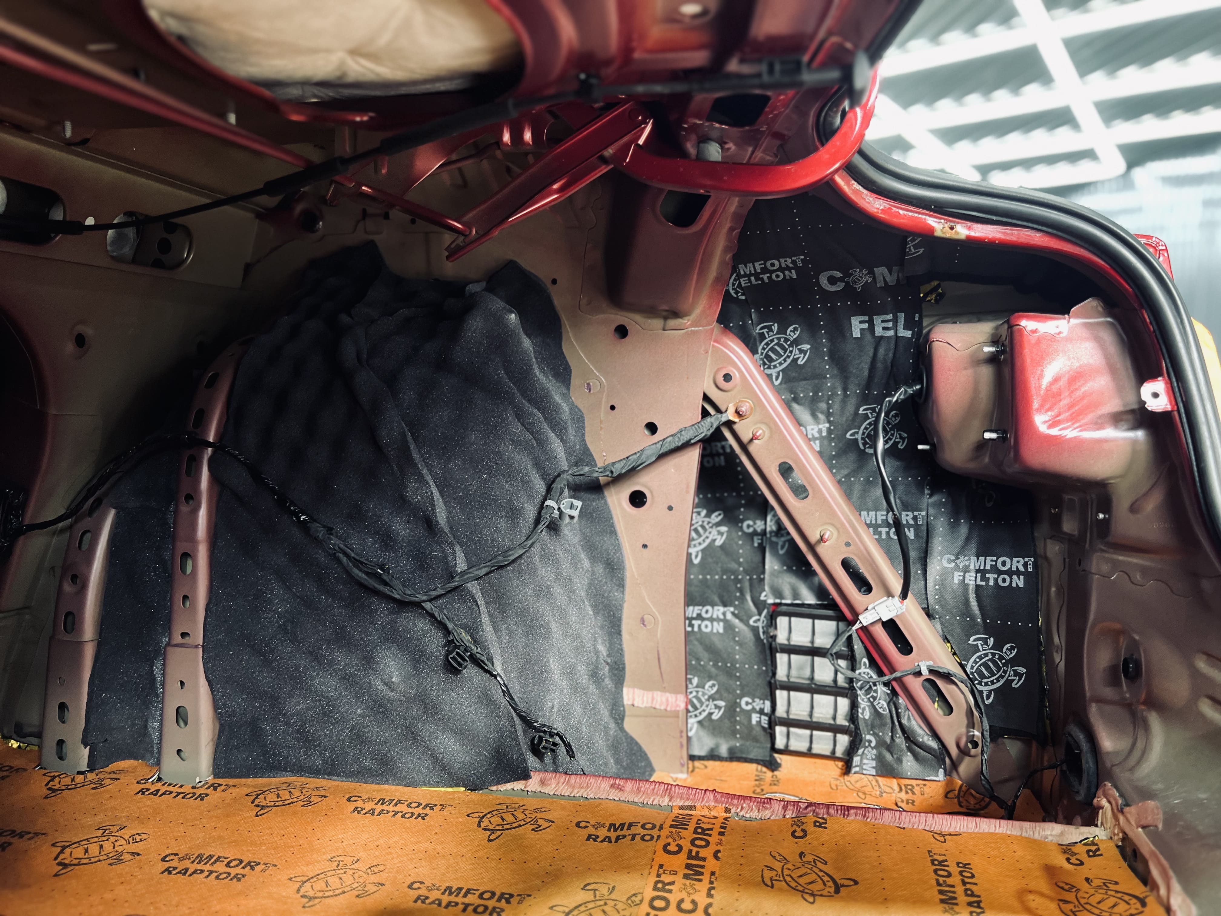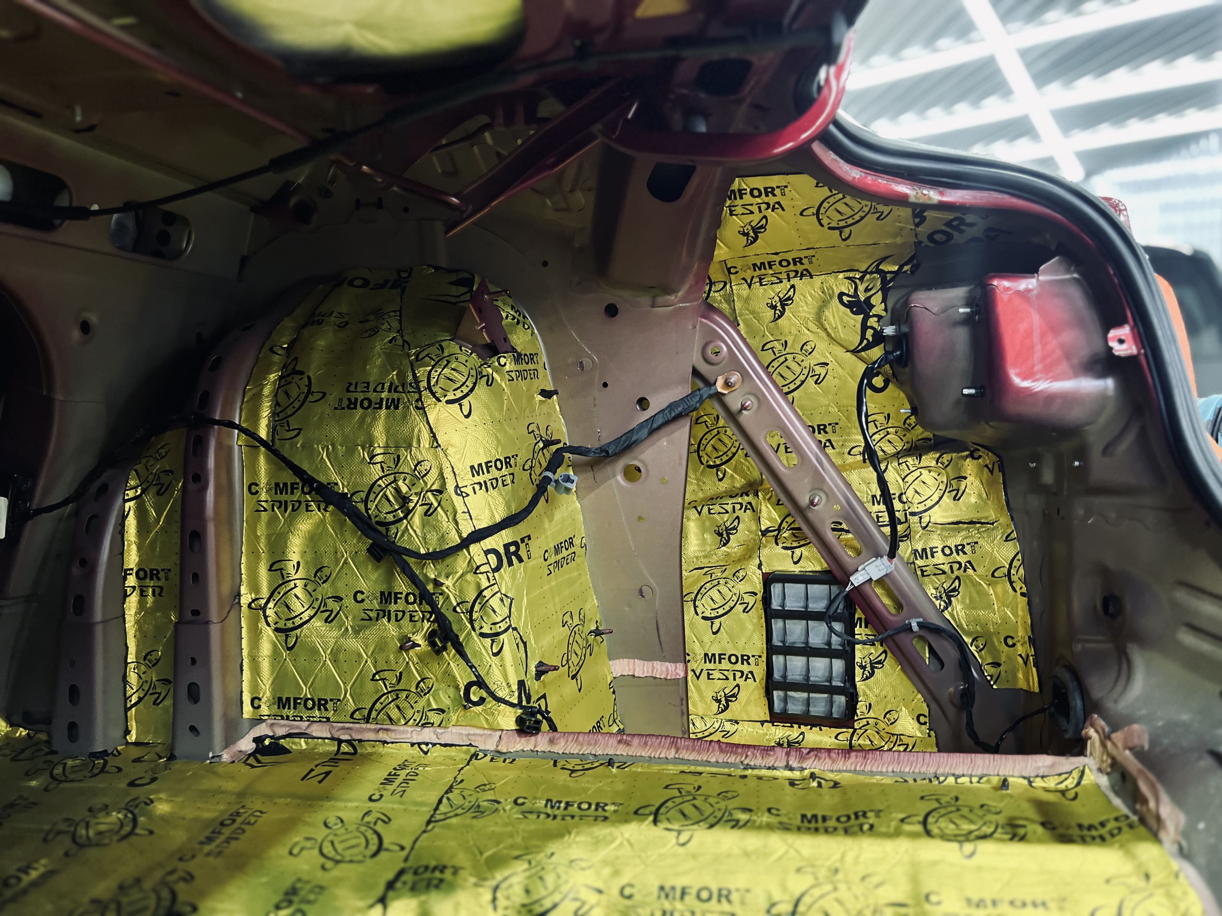 Первым слоем на днище и дно багажника нанесли виброизоляцию Comfort Mat Spider, а на стенки багажника – Comfort Mat Vespa.