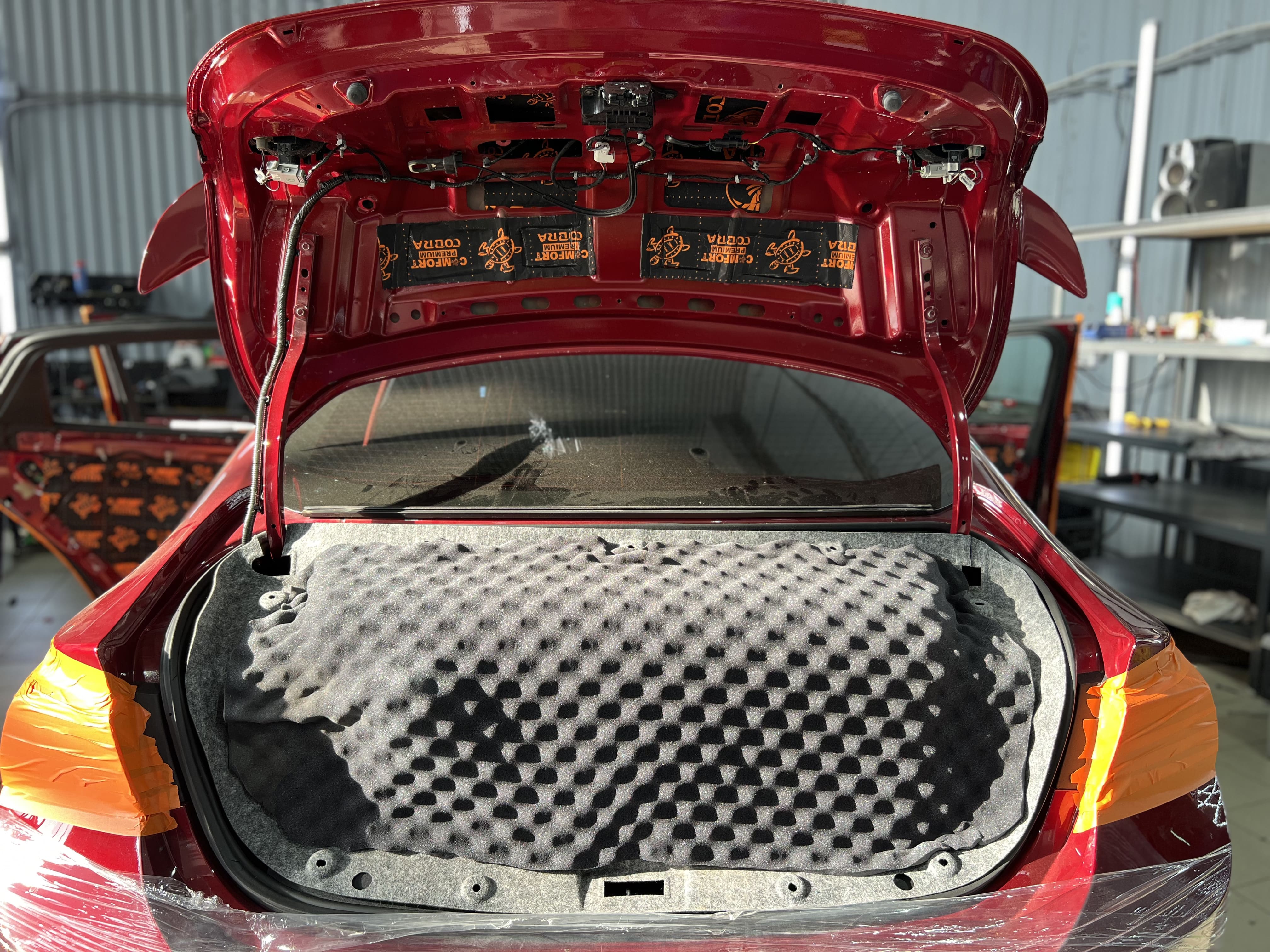 Финальным слоем на дверях и двери багажника стали виброизоляция Comfort Mat Dark Cobra на каркасе и шумопоглощающие волны Comfort Mat Тишина Volna, идеально вырезанные по размеру. На снимке видны дверь и дверь багажника с наклеенным слоем Dark Cobra и аккуратно вырезанными пирамидками - Тишина Volna.