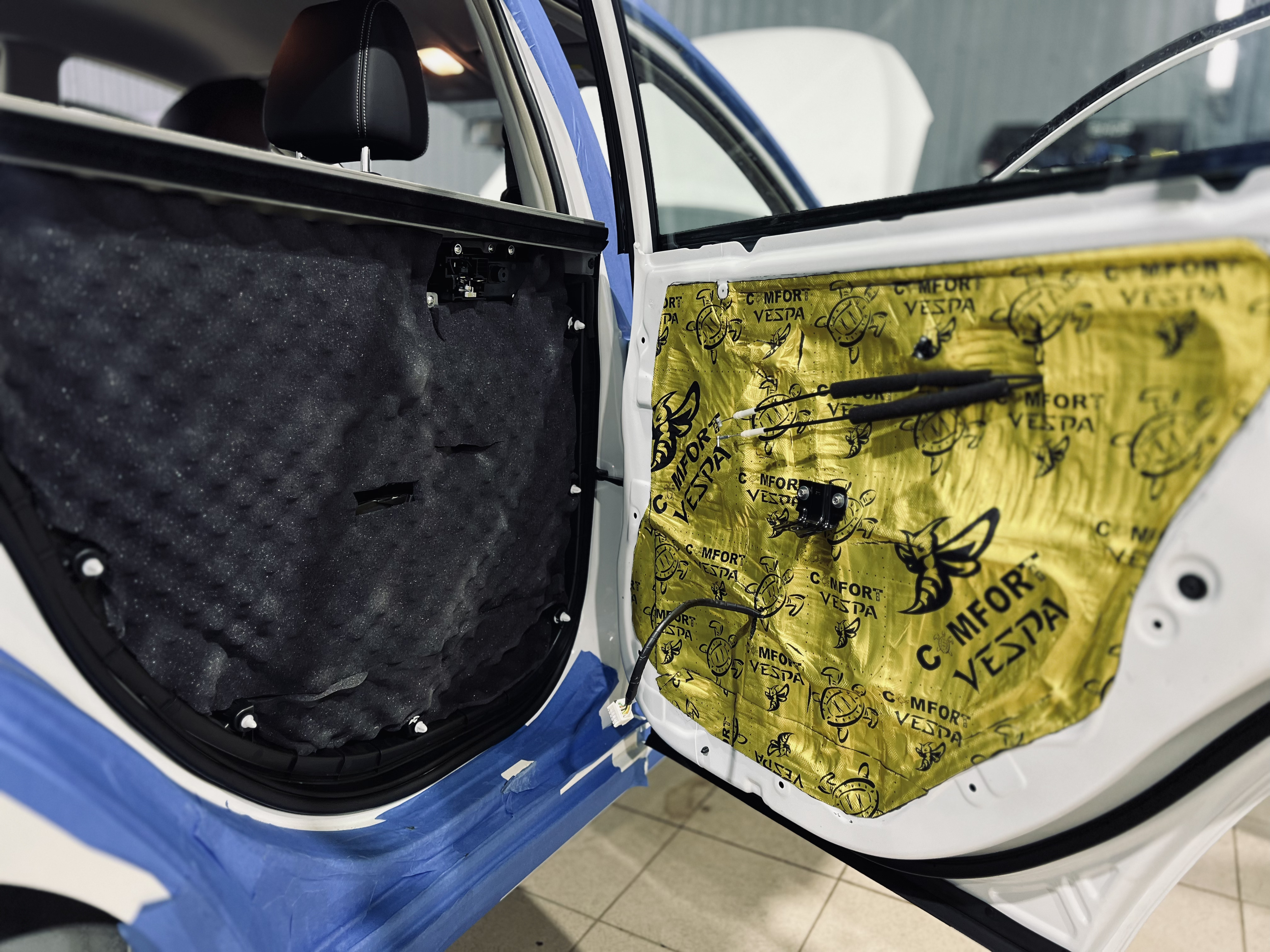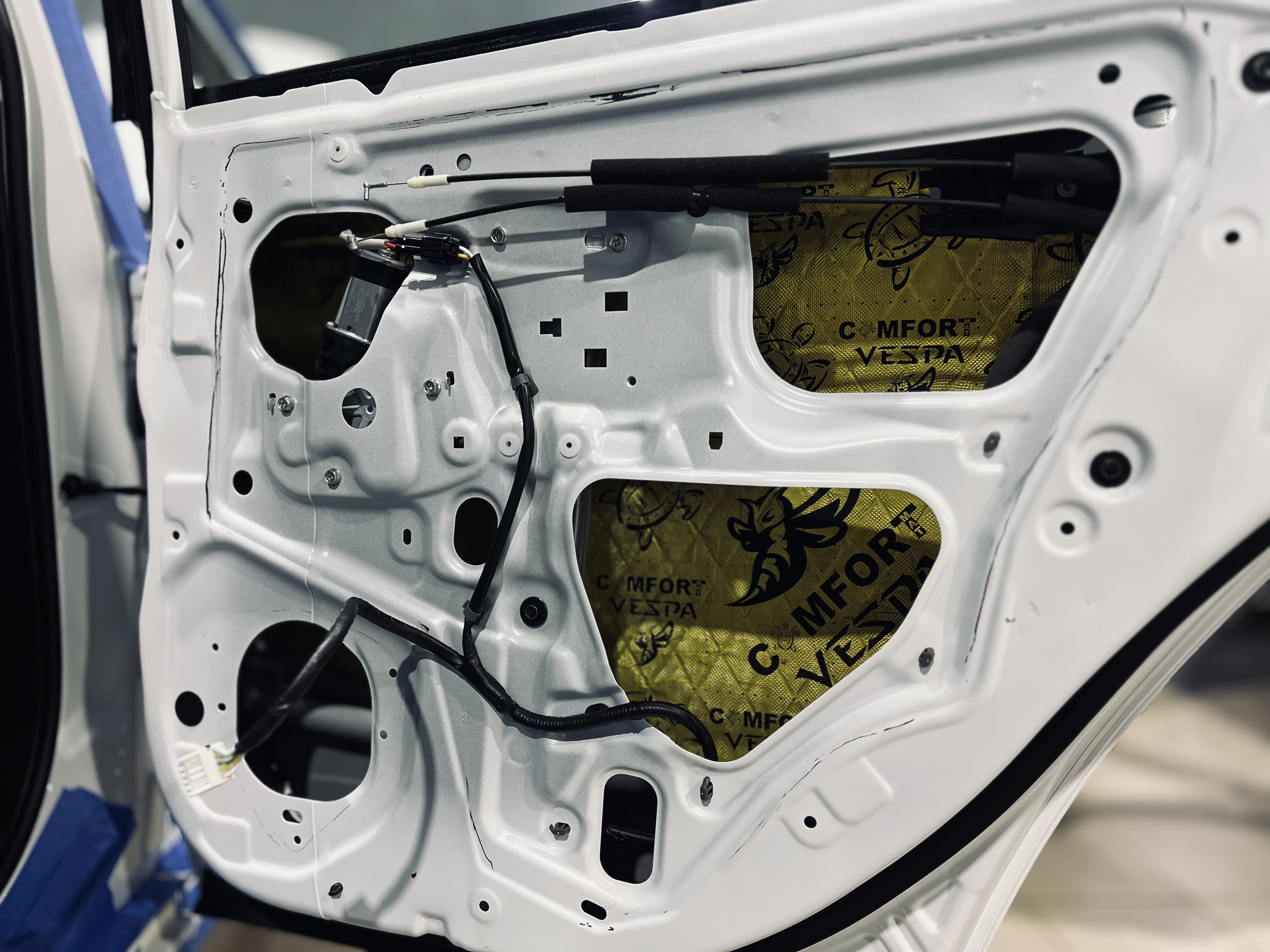 Для дверей и двери багажника использовали виброизоляция Comfort Mat Vespa, которая эффективно гасит вибрации. На фото видны двери и дверь багажника, покрытые слоем Vespa, с аккуратным нанесением.
