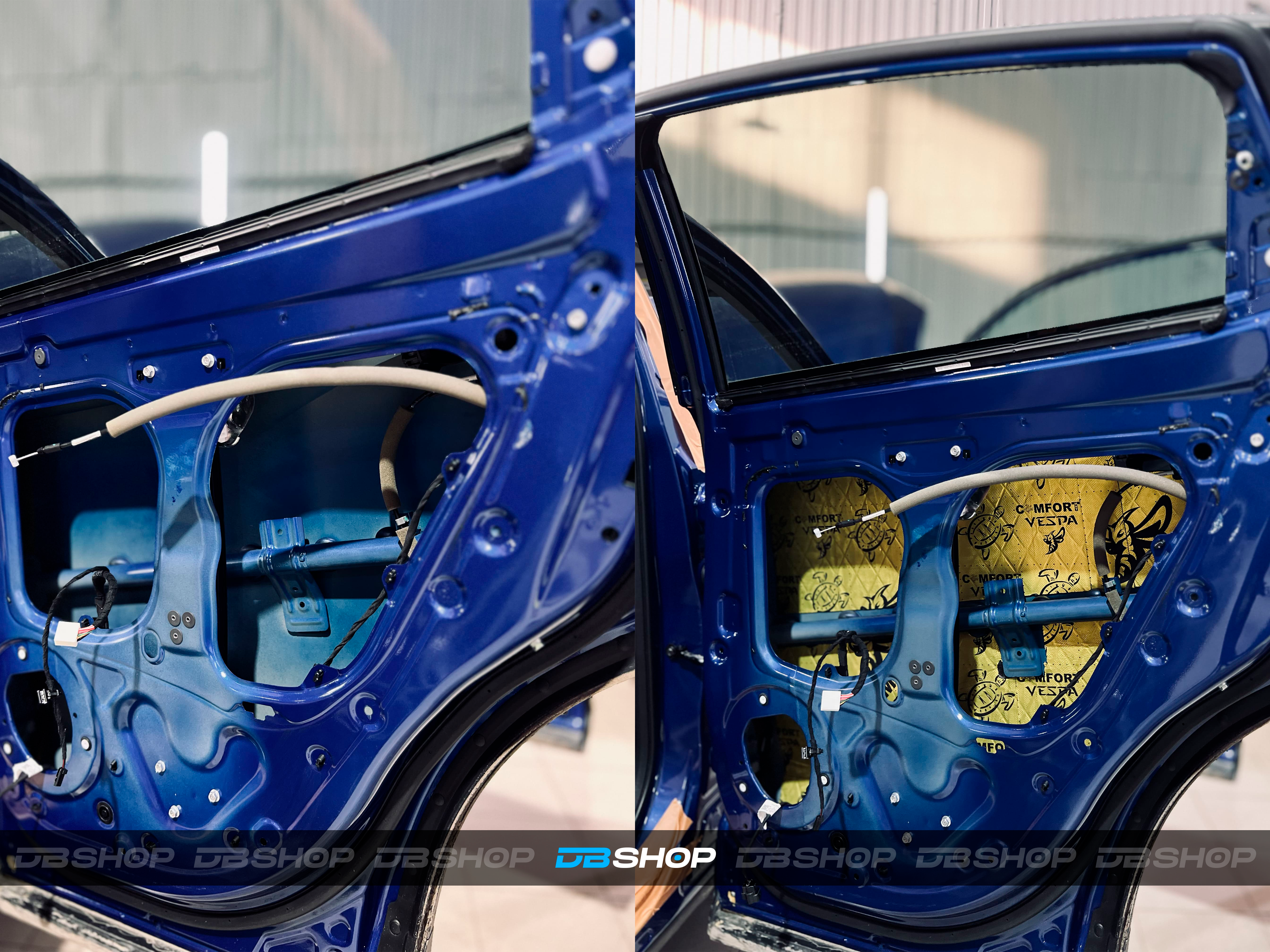 На двери и каркас двери, а также на дверь багажника нанесли виброизоляцию Comfort Mat Vespa и шумопоглощающие утолщенные волны Comfort Mat Тишина Volna, идеально вырезанные по размеру.