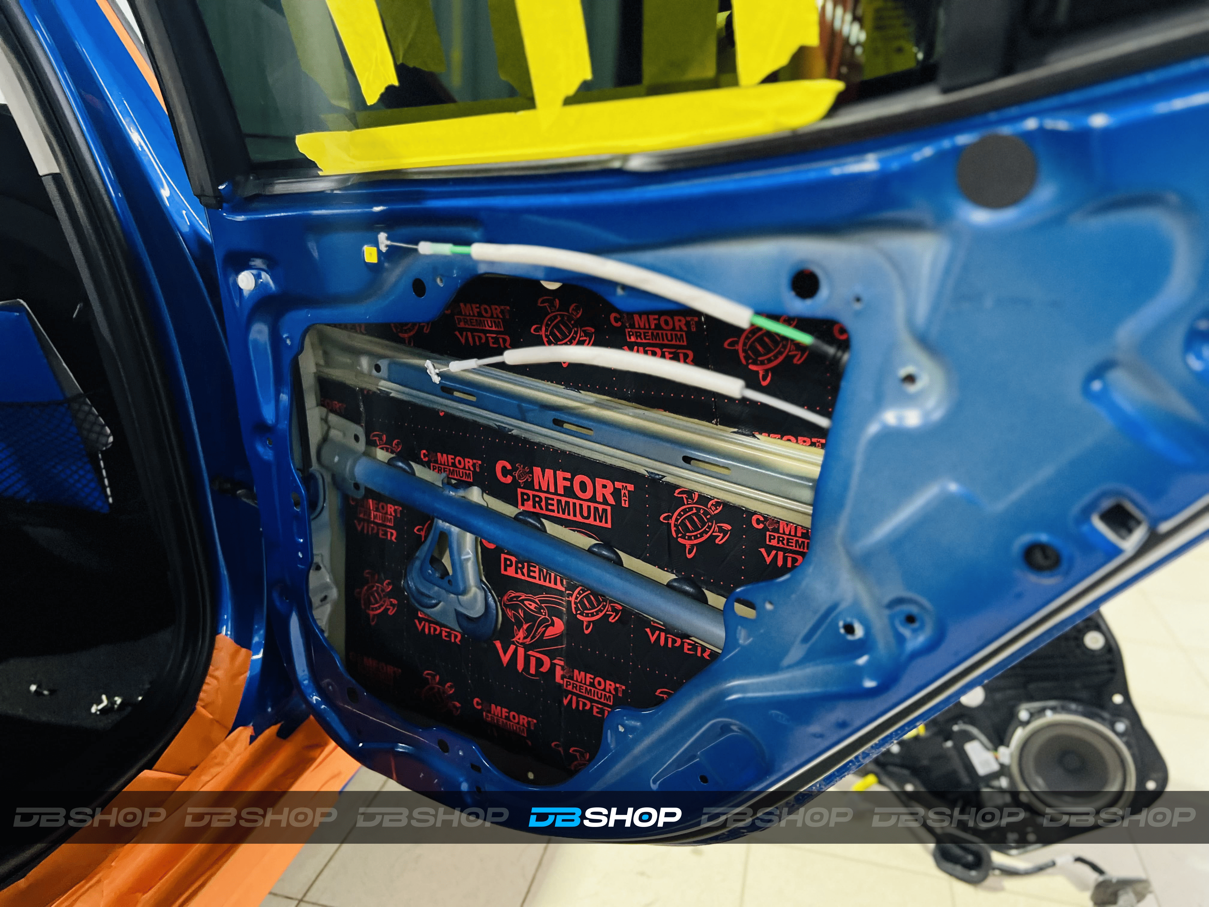 Первым слоем на двери нанесли виброизоляцию Comfort Mat Premium Viper. Ультралегкий инновационный виброизоляционный материал премиального уровня толщиной 3 мм с мастичным слоем и расширенным КМП. На фото видна дверь, покрытая слоем Premium Viper, с аккуратным нанесением.