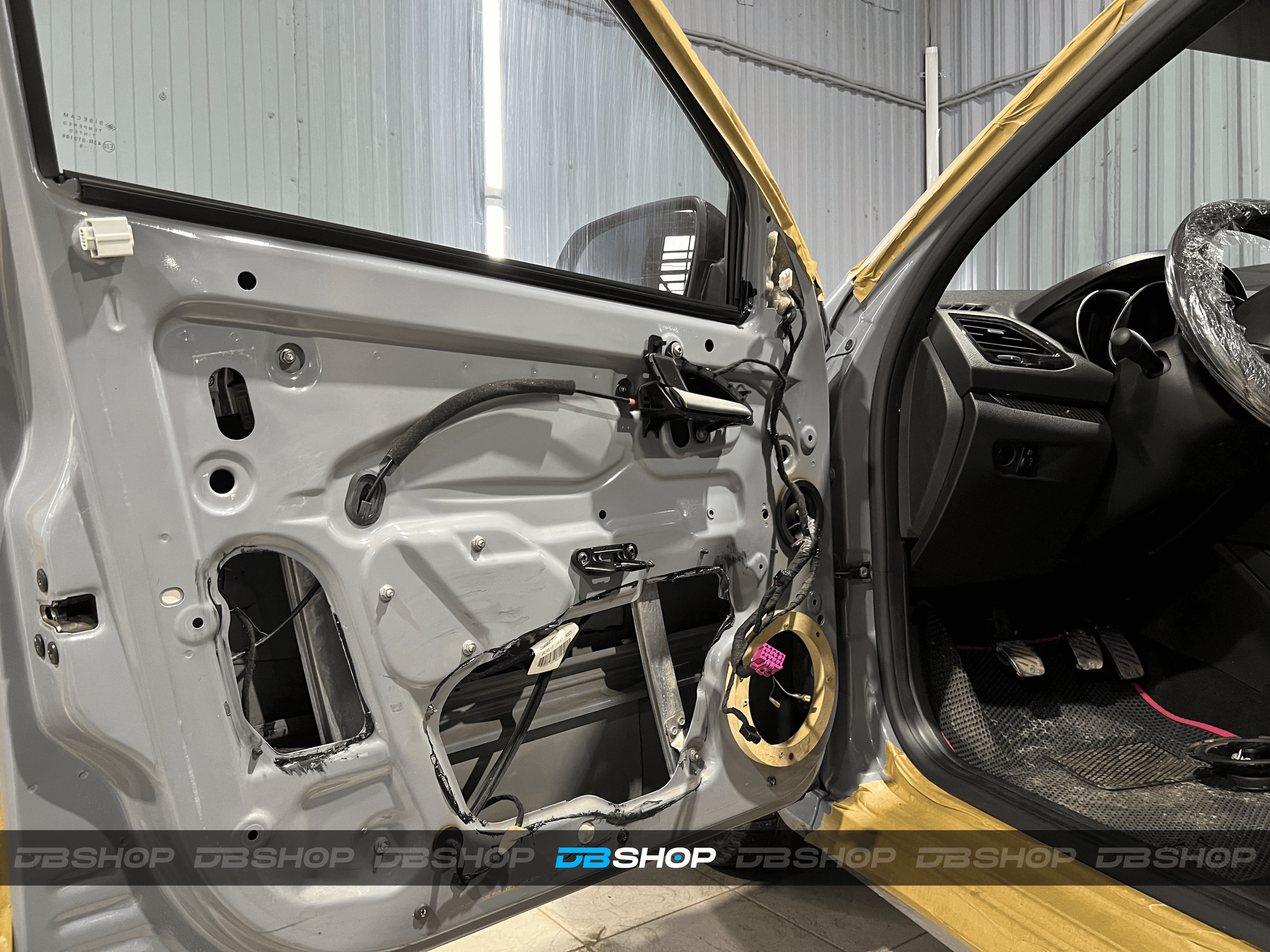 Работа началась с демонтажа дверных карт. На фото показана подготовленная дверь с чистым металлом, готовая к нанесению материалов.