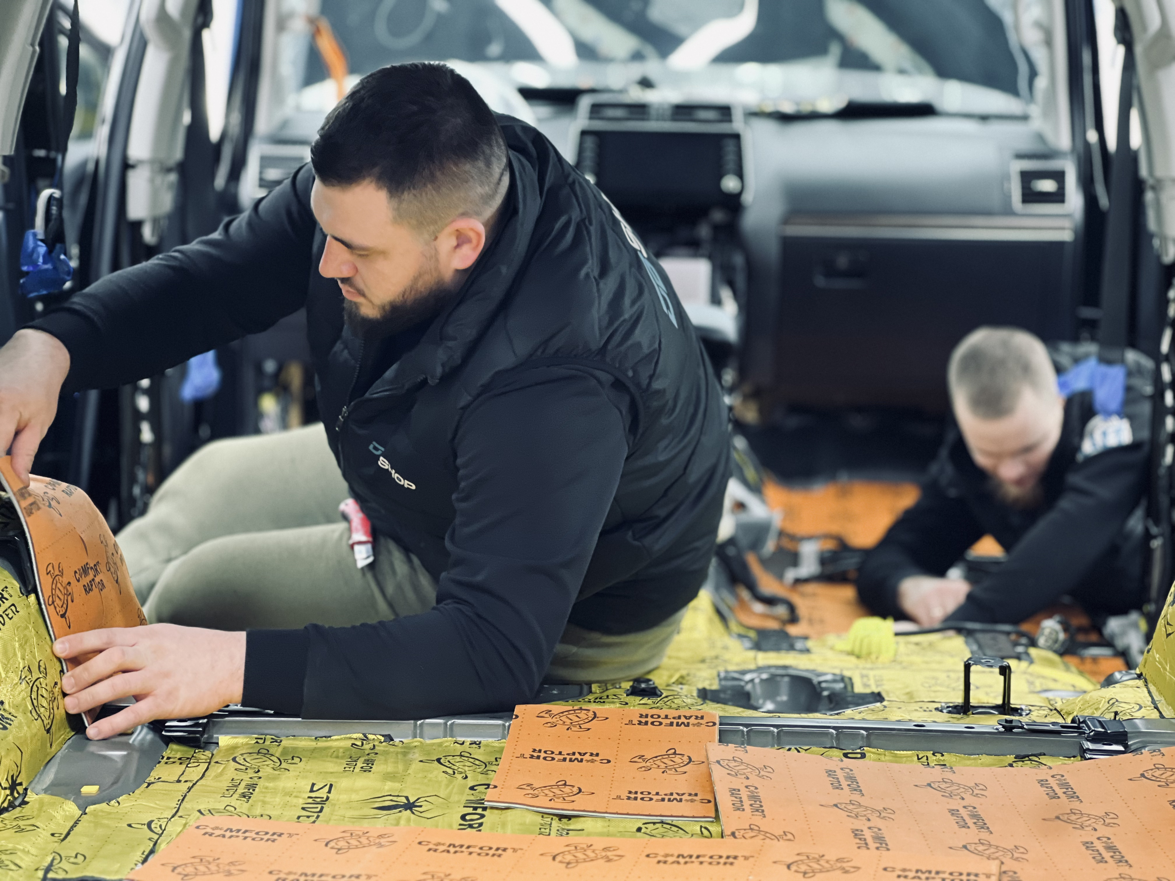 Шум от дороги, шин, подвески или ветра может проникать в салон Toyota Land Cruiser Prado, снижая удовольствие от вождения. Полная шумоизоляция днища, дверей, багажника и крыши минимизирует внешние звуки, улучшает акустику и делает поездки комфортнее, будь то городские улицы или бездорожье. Материалы Comfort Mat обеспечивают высокую эффективность, легкость и защиту кузова от коррозии.