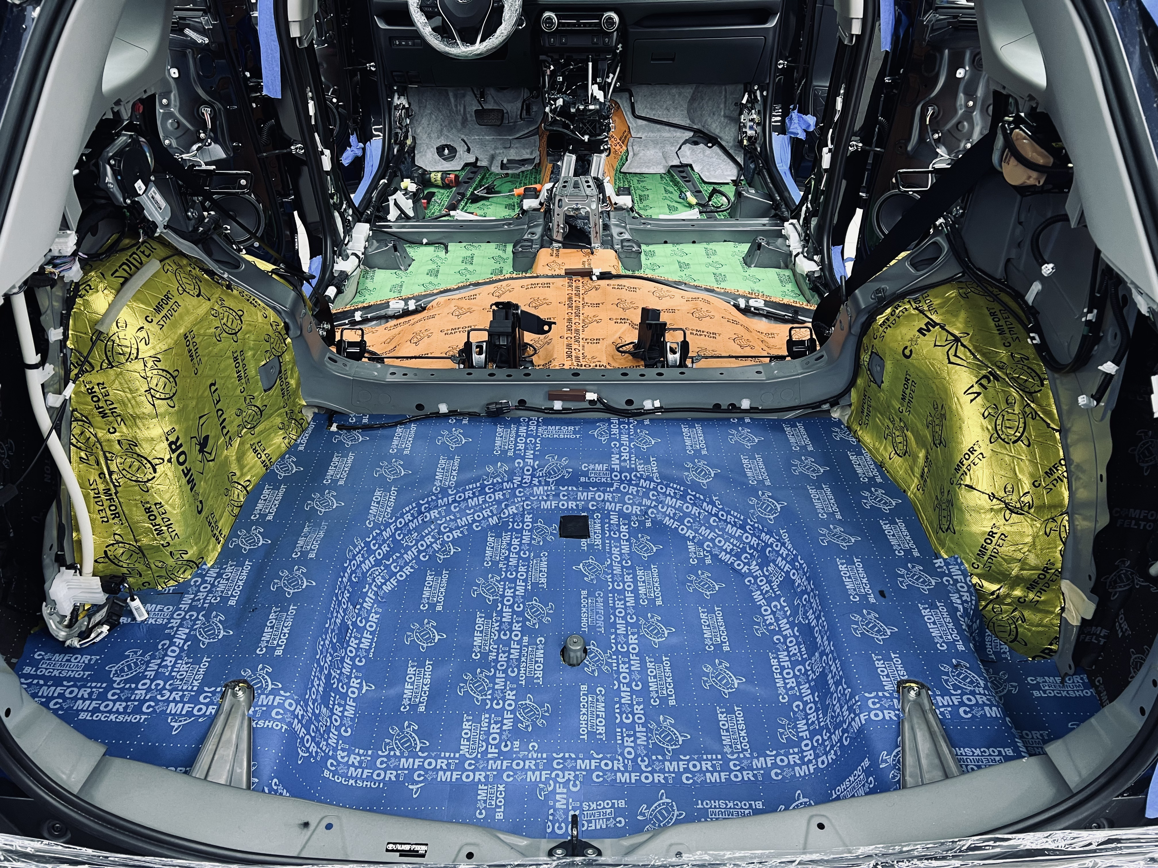 Вторым слоем в салоне применили комбинацию материалов: на дно – Comfort Mat Expert Titan, под задние пассажирские сиденья – Comfort Mat Raptor. Для герметизации швов и стыков мы использовали специальную контурную ленту в цвет шумоизоляции, что не только обеспечивает надежность, но и придает эстетичный вид, даже если он скрыт под ковровым покрытием.